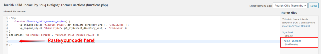 Then click on Theme Functions (functions.php) on the right-hand side of the screen, and paste your code at the bottom of the file above the ?>